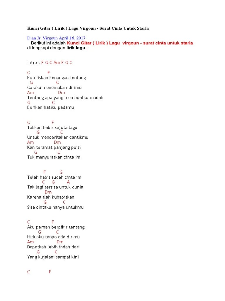 Contoh surat keterangan untuk psbb 1. Hangatkan jiwa kita c f sementara sinar surya perlahan mulai tenggelam dm g c suara gitarmu. Contoh surat tugas ketika seorang pegawai kepala suku dinas tenaga kerja dan transmigrasi melakukan tugas peninjauan atau monitoring ke perusahaan biasanya sudah dilengkapi dengan sebuah surat tugas sebagai tanda. Hingga kini video klip yang dirilis di channel youtube sejak 3 tahun yang lalu tersebut sudah ditonton lebih dari 305 juta kali. Kunci gitar dari single terbaru virgoun yang berjudul bukti yaitu lagu yang sengaja dibuat dan ditujukan untuk istrinya tercinta. Ini cuma di bikin m. cinta ini membunuhku (this love kills me) by: 2132014 intro g c b em c bm am d g c sumpah tak ada lagi b em kesempatan untuk ku ac d bisa bersamamu g c b kini ku tau bagaimana cara ku em ac d untuk dapat trus denganmu chorus g c bawalah pergi cintaku b em ajak ke mana pun kau mau c bm jadikan temanmu am d temanmu paling kau cinta g c di sini ku pun begitu b em trus cintaimu di hidupku c bm. Create and get +5 iq. chordtela disini dibatas kota ini. Capo di fret 5 (intro) am e am e am e am e am am dm tertuliskan sebuah cerita cinta segitiga g c dimana akulah yang jadi peran utama f dm aku tak dapat membohongi segala rasa e am e am aku mencintai dia dan dirinya. Cukup surat cinta yang aku berikan em d tulus dari hatiku ini yang paling dalam c bm am semoga kau mengerti d g semoga kau mengerti. Kunci gitar virgoun surat cinta untuk starla chord dasar kunci gitar amp lirik lagu c chordtela com surat cinta lirik lagu lirik.
