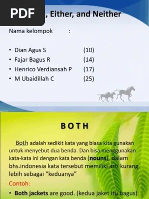 Penggunaan Either Neither / All About English Either Neither Wattpad - Tidak jarang kita juga berusaha untuk menangkap arti dan maksudnya dalam .. Sering sekali kata neither dan either diucapkan native speakers. Either digunakan untuk merujuk kemungkinan salah satu dari dua hal, sedangkan neither penolakan terhadap dua hal. Pada dasarnya, kata both, either, dan neither digunakan untuk membicarakan dua buah benda, baik itu benda hidup ataupun benda mati. Kosakata ini digunakan untuk memberi persetujuan atau kesepakatan atas pernyataan negatif. Tidak jarang kita juga berusaha untuk menangkap arti dan maksudnya dalam .