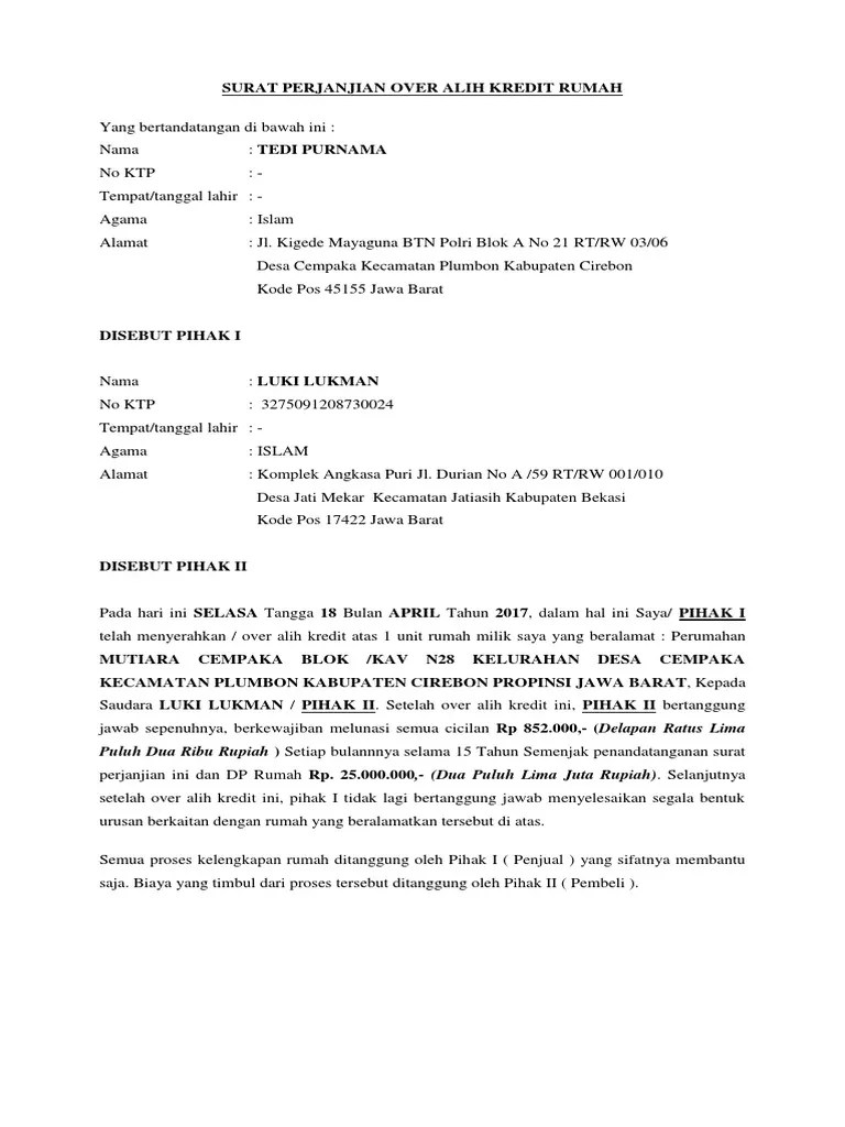 Surat perjanjian over kredit motor adalah surat pernyataan terkait proses kredit telah diambil alih oleh pihak kedua di mana pihak pertama tidak . Contoh surat perjanjian kredit sederhanafull description. Surat over kredit rumah yang bertanda tangan di bawah ini: Dengan ini menyatakan kedua belah pihak telah sepakat untuk mengikat diri dalam perjanjian over kredit rumah, yang berlokasi di komplek . Surat pernyataan over kredit rumah bu euis.